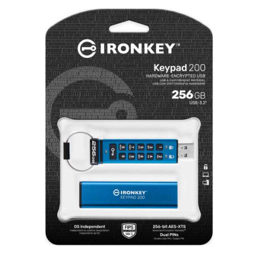 Kingston 256B IronKey Keypad 200 Memory Pen, USB-A 3.2 Gen1, FIPS 140-3 w/ XTS-AES 256-bit Hardware Encryption, Alphanumeric PIN, R/W 145/115 MB/s
