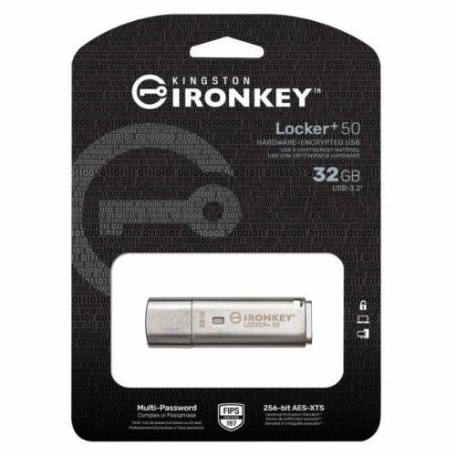Kingston 32GB IronKey Locker+ 50 Memory Pen, USB-A 3.2 Gen1, FIPS 197-certified, XTS-AES 256-bit Encrypted w/ Auto USBtoCloud Backup, R/W 145/115 MB/s