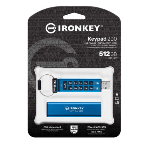 Kingston 512B IronKey Keypad 200 Memory Pen, USB-A 3.2 Gen1, FIPS 140-3 w/ XTS-AES 256-bit Hardware Encryption, Alphanumeric PIN, R/W 280/200 MB/s