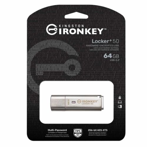 Kingston 64GB IronKey Locker+ 50 Memory Pen, USB-A 3.2 Gen1, FIPS 197-certified, XTS-AES 256-bit Encrypted w/ Auto USBtoCloud Backup, R/W 145/115 MB/s